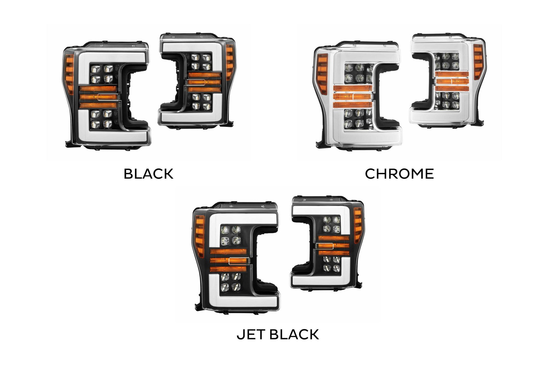 AlphaRex Is a relatively new brand in the automotive aftermarket industry. They've become known for building headlights that are unique in style, offer various color choices, and better than average construction quality. While (in our testing) they don't do as well as the slightly more expensive Morimoto XB LED headlights, they do offer good bang for the buck and certainly worth considering. If you're interested to see what else we've got in stock for your truck, use the buyer's guide on our website! AlphaRex Design Alpharex Nova Series Headlights for the Ford Super Duty use their signature 3D ice-cube projector lens system inside. Besides the horizontal NOVA projector row, They have also added a LED tube around the edge as DRL and sequential turn signal. The LED tube is not only used as switchback DRL and turn signal, it also has the activation light feature which is an animated lighting sequence when you unlock and lock your vehicle. These projector headlights have a quad projector design, with the outer 3 projector as low beam, and inner projector as high beam. Ice Cube Projector Technology AlphaRex integrated their patented Ice Cube 3D LED Projectors that are powered by Osram Black Flat LED Chips. The jewel eye projectors look great inside of the Ford Super Duty Nova Series Headlights. The projection cut-off line is perfect for American LHD regulation. Features: The AlphaRex Ford Super Duty Nova-series projector headlights come with switchback DRL, sequential signal light, and the signature activation light feature, which is a sequential light show when you unlock your car. Housing: The Ford Super Duty Nova-series projector headlights are offered with either a chrome, matte black, or shiny midnight black housing. The chrome housing gives your truck a stock housing look and match your truck if you have a lot of chrome accessories. On the other hand, the black housing gives your truck a sporty look and easily match with any color truck and front grill. Above all, the gloss/ jet black housing and mid-night black housing (all black housing with glossy finish) are their specially designed versions that has a combination of glossy looks mixed with the black paint, and it will give your truck a sporty and luxury look at the same time. Lenses: The AlphaRex headlight lenses are made of polycarbonate plastic. They also apply a layer of anti-fog agent on the headlights lens; thus, it allows better light output in extreme weather. In addition, they also apply another coating to protect the lens against yellowing and oxidation. SAE/DOT Compliance: Our Ford Super Duty Nova-series projector headlights are compliant with SAE and DOT FMVSS108 regulations. Moreover, all our products are certified to ISO-9000, ISO-9001 and ISO-9002. Most importantly, we inspect every detail of the lights to make sure we are satisfied and so are our customers. Installation: Our projector headlights are plug-n-play direct replacement for your truck. You can download the installation guide from the link in the listing above. Because these headlights have a DRL feature, you will need to apply the DRL module included in the package. No modification is required for installing these headlights; thus, our headlights are easily removable when you need to return or sell your truck and it will not void your factory warranty.What's Included