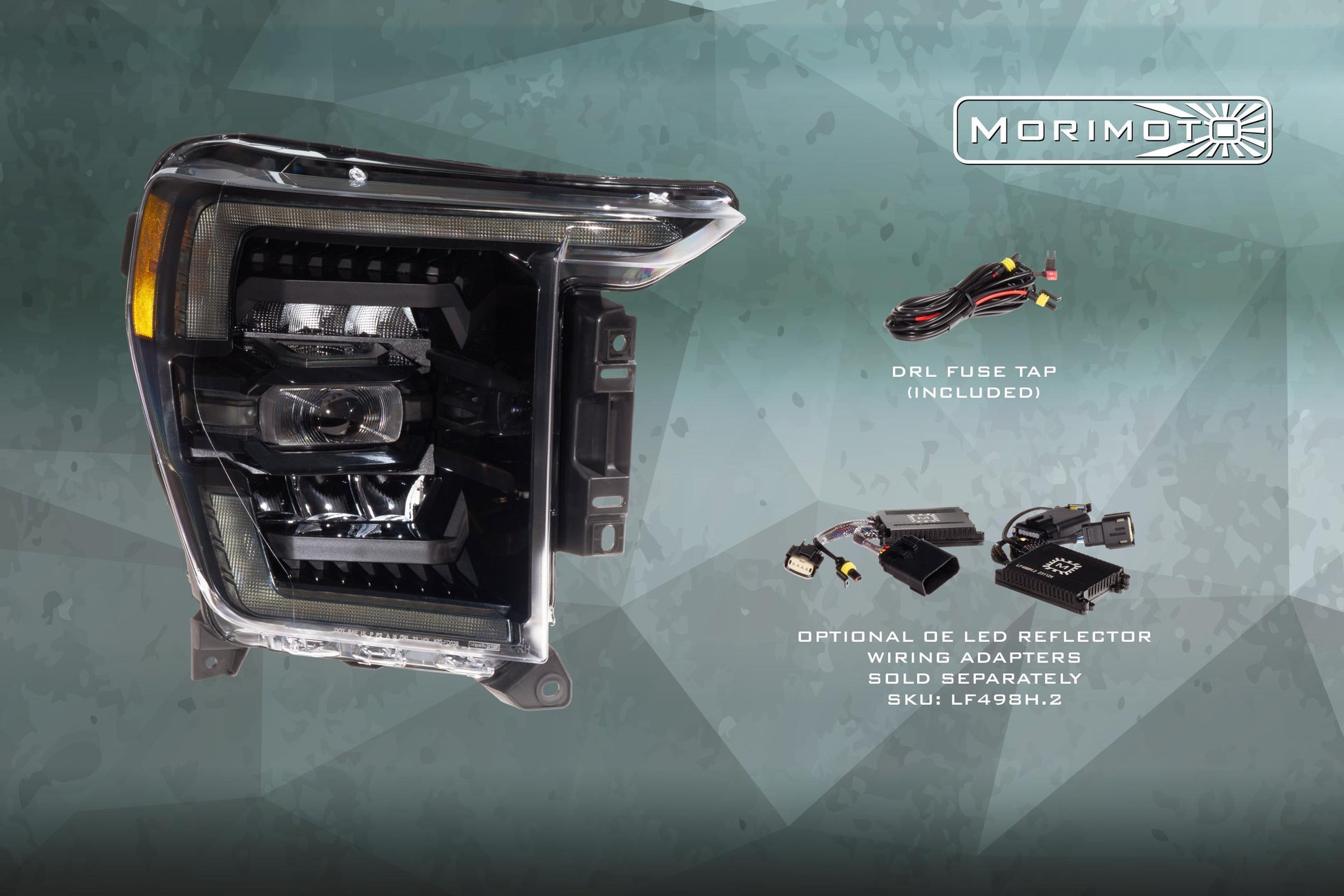 Game Changer: The game has just changed, again. If you've got a 2021+ F150 and you paid extra for the OEM LED headlights, well... hind sight hurts doesn't it? If you're thinking about buying one, the Morimoto XB LED headlights for the 2021+ Ford F150 should be the first thing on your wish list. It's hard to imagine anything better than this when it comes to looks, performance, and functionality. They are the full package. Future Spec: Alright so where do we begin? Lets throw subjectivity out the door and talk about how great the new F150 LED headlights from Morimoto look. With a single large rectangular projector front and center that's surrounded by a Ford GT-esque shroud that elegantly flows into the lines of the grille, they look right at home. On the top and bottom, we've incorporated LED reflector optics that assist the Bi-LED projector while enhancing the OEM+ appearance. Daytime Running Lights: The daytime running light does eliminate the controversial L-shaped DRL on the 21+ F150 in favor of a more traditional C-shaped outline. This is ideal for owners who either have the standard halogen fog lights (without the integrated DRL) or who are replacing the stock fog lights with aftermarket units. The DRL optics do double duty as the turn signals - which like other XB LED headlights from Morimoto feature the full sequential setup, but can be also be ran in an instant-on/off mode for folks who want something a little more conservative. Unmatched Visibility: These use single Bi-LED projector with a unique over-sized optic that produces an impressive amount of light output. In addition, LED reflector-based optics above and below the projector assist in boosting overall beam coverage and intensity throughout. These things completely blow away the OEM halogen headlights, and even out-perform the OEM LED headlights in many ways too. DOT Approved: All that goodness, and the Morimoto XB LED headlights for the new Ford F150 are still fully compliant. Their projector optics meet & exceed all SAE, DOT, and FMVSS108 standards. The US market lights will be equipped with amber side markers as well. Plug and Play: The Installation is relatively easy too. These headlights are designed to work on your truck without any modifications. They will plug into the factory connectors and fit flush with all pre-existing mounting points. No error codes, no flickering, hyper-flashing, or radio interference. They can easily be removed and will not void your factory warranty. Note that if your new F150 has the OE Reflector-LED headlights, you will need to buy the LF498H adapter harnesses to ensure full-functionality with the complicated Linbus system. They will not work on trucks with the OE dual-projector based headlights.What's Included